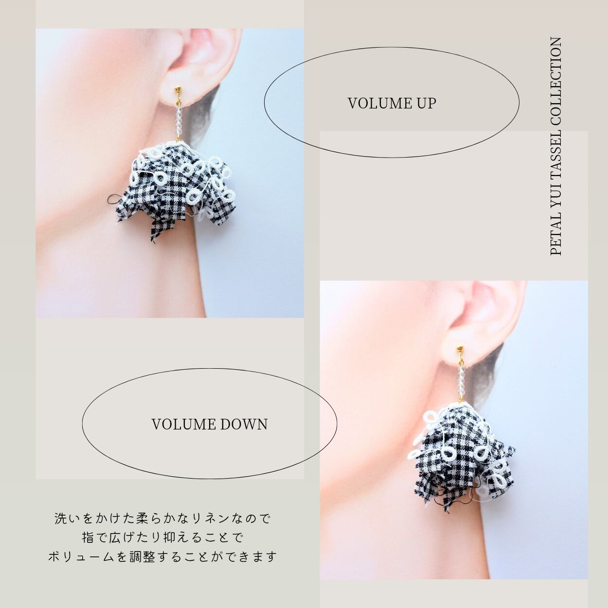 【耳飾り】Linen petal / yui tassel with glass cut beads 〇 かろやかリネン×yuiタッセルの耳飾り ギンガムブラック