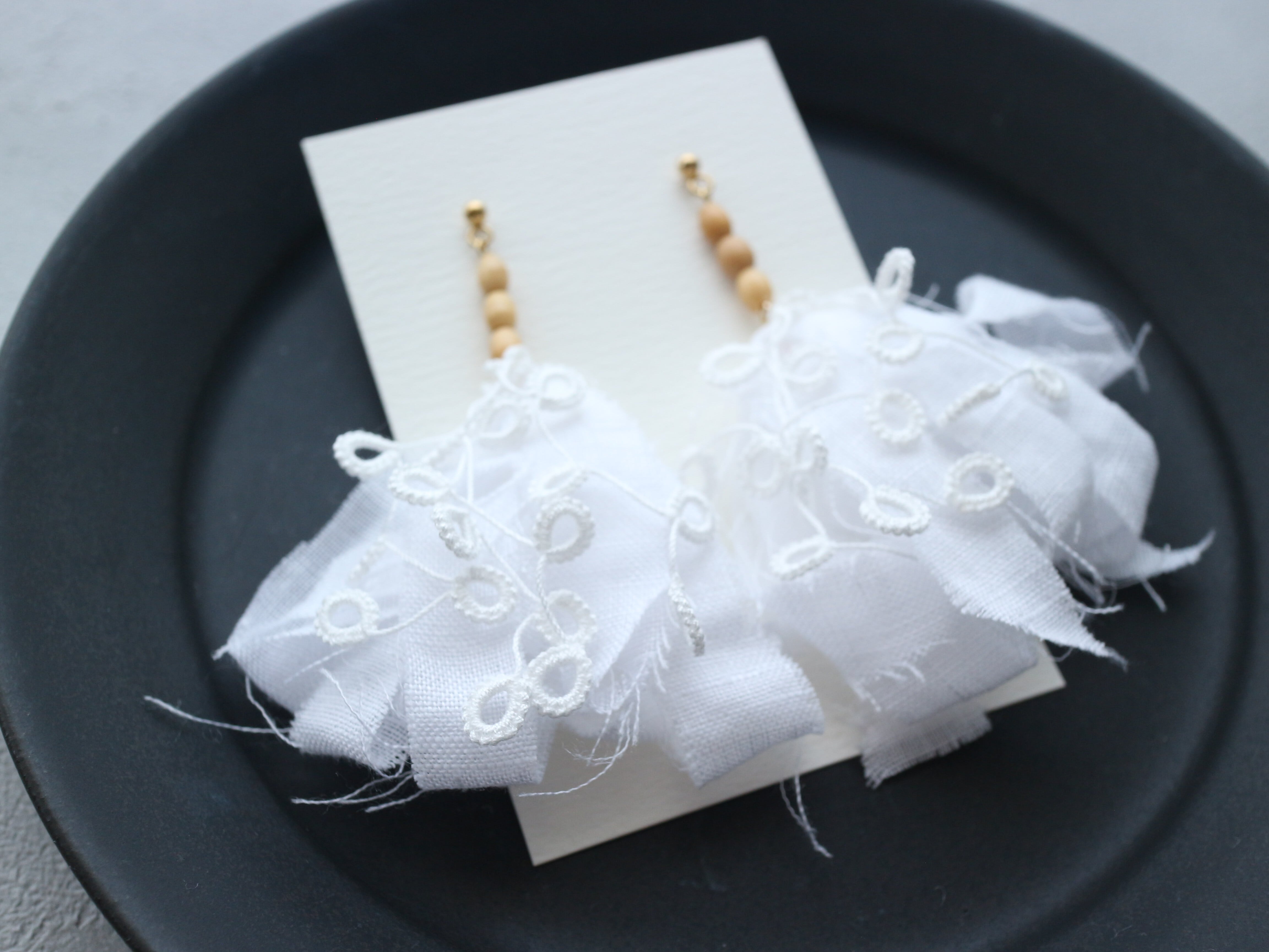 【耳飾り】Linen petal / yui tassel with wood beads 〇 かろやかリネン×yuiタッセルの耳飾り ホワイト